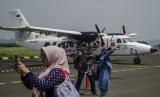 Warga berfoto di depan pesawat PT Dirgantara Indonesia (PTDI) N219 Nurtanio pada HUT ke-46 PTDI di Landasan Hanggar PTDI, Bandung, Jawa Barat, Sabtu (27/8/2022). Kegiatan tersebut sekaligus sebagai ajang pengenalan pesawat produksi PTDI guna menumbuhkan rasa cinta masyarakat terhadap teknologi dirgantara Indonesia. (FOTO : ANTARA/Novrian Arbi)