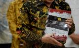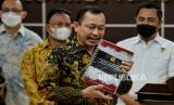 Ketua Komnas HAM Ahmad Taufan Damanik memegang berkas laporan hasil pemantauan dan penyelidikan peristiwa penembakan brigadir J sebelum diserahkan kepada pihak Kepolisian yang diwakili Inspektur Pengawasan Umum (Irwasum) Komjen Agung Budi Maryoto di kantor Komnas HAM, Jakarta, Kamis (1/8/2022). Irwasum Komjen Agung Budi Maryoto mengatakan bahwa Polri akan menindaklanjuti hasil rekomendasi dari Komnas HAM terkait kasus dugaan pembunuhan berencana terhadap Brigadir J hingga persidangan (FOTO : Republika/Thoudy Badai)