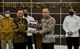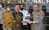 Ketua Komnas HAM Ahmad Taufan Damanik menyerahkan laporan hasil pemantauan dan penyelidikan peristiwa penembakan brigadir J kepada pihak Kepolisian yang diwakili Inspektur Pengawasan Umum (Irwasum) Komjen Agung Budi Maryoto di kantor Komnas HAM, Jakarta, Kamis (1/8/2022). Irwasum Komjen Agung Budi Maryoto mengatakan bahwa Polri akan menindaklanjuti hasil rekomendasi dari Komnas HAM terkait kasus dugaan pembunuhan berencana terhadap Brigadir J hingga persidangan. (FOTO : Republika/Thoudy Badai)