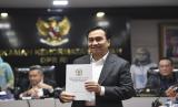 Anggota Komisi I DPR Effendi Simbolon menunjukkan surat putusan usai sidang putusan dugaan pelanggaran etik terkait ucapannya TNI seperti gerombolan oleh Mahkamah Kehormatan Dewan (MKD) DPR RI di Kompleks Parlemen, Senayan, Jakarta, Kamis (15/9/2022). Dalam sidang tersebut, MKD DPR memutuskan untuk menghentikan kasus aduan terkait ucapan dari Effendi Simbolon. (FOTO : ANTARA/M Risyal Hidayat)