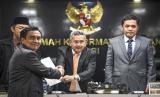 Wakil Ketua Mahkamah Kehormatan Dewan (MKD) DPR RI selaku pimpinan sidang, Trimedya Panjaitan (kedua kanan) memberikan surat putusan kepada anggota Komisi I DPR Effendi Simbolon (kedua kiri) disaksikan pimpinan lainnya Habiburokhman (kanan) dan Maman Imanul (kiri) saat sidang putusan dugaan pelanggaran etik terkait ucapan TNI seperti gerombolan di Kompleks Parlemen, Senayan, Jakarta, Kamis (15/9/2022). Dalam sidang tersebut, MKD DPR memutuskan untuk menghentikan kasus aduan terkait ucapan dari Effendi Simbolon. (FOTO : ANTARA/M Risyal Hidayat)