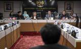 Wakil Ketua Mahkamah Kehormatan Dewan (MKD) DPR RI selaku pimpinan sidang, Trimedya Panjaitan (kedua kiri), didampingi pimpinan lainnya Habiburokhman (kedua kanan) dan Maman Imanul (kiri) memimipin jalannya sidang putusan dugaan pelanggaran etik dari anggota Komisi I Effendi Simbolon terkait ucapannya TNI seperti gerombolan di Kompleks Parlemen, Senayan, Jakarta, Kamis (15/9/2022). Dalam sidang tersebut, MKD DPR memutuskan untuk menghentikan kasus aduan terkait ucapan dari Effendi Simbolon. (FOTO : ANTARA/M Risyal Hidayat)