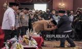 Ketua Umum PP Persatuan Islam KH Aceng Zakaria (kanan) bersalaman dengan Gubernur Jawa Barat Ridwan Kamil (kedua kanan) saat pembukaan Muktamar XVI Persatuan Islam di Soreang, Kabupaten Bandung, Sabtu (24/9/2022). Muktamar XVI Persatuan Islam (Persis) yang dilaksanakan pada 23-26 September 2022 tersebut mengusung tema Transformasi Gerakan Dakwah Persis Untuk Mewujudkan Islam Rahmatan Lil Alamien Dalam Bingkai NKRI. (FOTO : REPUBLIKA/ABDAN SYAKURA)