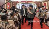 Menteri BUMN Erick Thohir (tengah) menyapa peserta muktamar usai menyampaikan orasi kebangsaan pada Muktamar XVI Persatuan Islam (Persis) di Soreang, Kabupaten Bandung, Sabtu (24/9/2022). Pada kesempatan tersebut Menteri BUMN Erick Thohir menyampaikan orasi kebangsaan dengan tema Langkah-langkah Strategis Penguatan Ekonomi Umat Untuk Indonesia Maju dan Berdikari. Republika/Abdan Syakura (FOTO : REPUBLIKA/ABDAN SYAKURA)