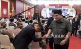 Menteri BUMN Erick Thohir (kanan) menyalami peserta muktamar usai menyampaikan orasi kebangsaan pada Muktamar XVI Persatuan Islam (Persis) di Soreang, Kabupaten Bandung, Sabtu (24/9/2022). Pada kesempatan tersebut Menteri BUMN Erick Thohir menyampaikan orasi kebangsaan dengan tema Langkah-langkah Strategis Penguatan Ekonomi Umat Untuk Indonesia Maju dan Berdikari. Republika/Abdan Syakura (FOTO : REPUBLIKA/ABDAN SYAKURA)