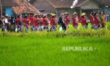 Peserta menggunakan pakaian petani jaman dahulu saat mengikuti kirab Bedol Projo Sidokarto 2022 di Sleman, Yogyakarta, Ahad (25/9/2022). Kegiatan kirab ini diikuti oleh 14 pedukuhan dan 5 komplek perumahan yang berada di Kelurahan Sidokarto, Sleman. Disamping kirab, juga diadakan berbagai kegiatan seperti pasar murah, jalan sehat yang merekatkan kembali kebersamaan antarwarga. Selain itu, juga untuk melestarikan budaya dan tradisi. (FOTO : Republika/Wihdan Hidayat)