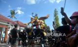 Warga mengusung ogoh-ogoh mengikuti kirab Bedol Projo Sidokarto 2022 di Sleman, Yogyakarta, Ahad (25/9/2022). Kegiatan kirab ini diikuti oleh 14 pedukuhan dan 5 komplek perumahan yang berada di Kelurahan Sidokarto, Sleman. Disamping kirab, juga diadakan berbagai kegiatan seperti pasar murah, jalan sehat yang merekatkan kembali kebersamaan antarwarga. Selain itu, juga untuk melestarikan budaya dan tradisi. (FOTO : Republika/Wihdan Hidayat)