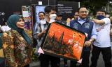 Gubernur DKI Jakarta Anies Baswedan (kedua kanan) didampingi Direktur Utama Jakarta Experience Board (JXB) Novita Dewi (kiri) menerima karya lukis dari warganya saat meresmikan Jakarta Street Experience (JSX) di Taman Ismail Marzuki (TIM), Jakarta, Senin (26/9/2022). JSX merupakan instalasi interaktif yang menggabungkan unsur edukasi, informasi, seni, dan teknologi pintar yang diharapkan dapat mendorong minat masyarakat untuk mengeksplorasi kota dengan berjalan kaki. (FOTO : ANTARA/M Risyal Hidayat)