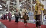 Peserta mengikuti peragaan busana saat kegiatan Lomba Pemanfaatan Pakaian Bekas Menjadi Kebaya Klasik atau Modern di Pendopo Kota Bandung, Jalan Dalem Kaum, Kota Bandung, Selasa (27/9/2022). Peragaan busana kebaya dari daur ulang pakaian bekas tersebut diikuti oleh perwakilan anggota Pemberdayaan Kesejahteraan Keluarga (PKK) di 30 kecamatan di Kota Bandung. Kegiatan tersebut sebagai bentuk kampanye peningkatan kesadaran lingkungan dan pengolahan limbah. (FOTO : REPUBLIKA/ABDAN SYAKURA)