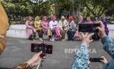 Peserta berfoto disela kegiatan Lomba Pemanfaatan Pakaian Bekas Menjadi Kebaya Klasik atau Modern di Pendopo Kota Bandung, Jalan Dalem Kaum, Kota Bandung, Selasa (27/9/2022). Peragaan busana kebaya dari daur ulang pakaian bekas tersebut diikuti oleh perwakilan anggota Pemberdayaan Kesejahteraan Keluarga (PKK) di 30 kecamatan di Kota Bandung. Kegiatan tersebut sebagai bentuk kampanye peningkatan kesadaran lingkungan dan pengolahan limbah. (FOTO : REPUBLIKA/ABDAN SYAKURA)