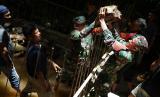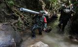 Anggota TNI Bintara Pembina Desa (Babinsa) Koramil 1417-14/Soropia bersama warga membawa material untuk pembangunan tampungan air bagi Suku Bajo di Desa Leppe, Konawe, Sulawesi Tenggara, Sabtu (1/10/2022). Koramil 1417-14/Soropia bersama warga membuat tampungan air pegunungan agar masyarakat Suku Bajo yang berjumlah sekitar tiga ribu jiwa dan bermukim di lima desa bisa menikmati air bersih untuk kebutuhan sehari-hari. (FOTO : ANTARA/Jojon)