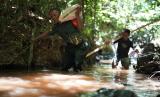 Anggota TNI Bintara Pembina Desa (Babinsa) Koramil 1417-14/Soropia bersama warga mengumpulkan material batu kali untuk pembangunan tampungan air bagi Suku Bajo di Desa Leppe, Konawe, Sulawesi Tenggara, Sabtu (1/10/2022). Koramil 1417-14/Soropia bersama warga membuat tampungan air pegunungan agar masyarakat Suku Bajo yang berjumlah sekitar tiga ribu jiwa dan bermukim di lima desa bisa menikmati air bersih untuk kebutuhan sehari-hari. (FOTO : ANTARA/Jojon)