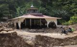 Dua pengendara sepeda motor melintas di depan masjid yang terkena longsor akibat banjir bandang di Desa Sondoang, Kecamatan Kalukku, Mamuju, Sulawesi Barat, Jumat (14/10/2022). Berdasarkan data sementara Badan Penanggulangan Bencana Daerah (BPBD) Kabupaten Mamuju sebanyak enam rumah hanyut, dua rumah tertimbun longsor, dan 13 rumah rusak berat serta 1.625 kepala keluarga dengan 5.273 jiwa terdampak musibah tersebut. (FOTO : ANTARA/Akbar Tado)