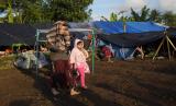 Orang-orang yang terlantar akibat gempa Senin berjalan di dekat tempat penampungan sementara di Cianjur, Jawa Barat, Indonesia, Kamis, 24 November 2022. Gempa berkekuatan 5,6 skala Richter menyebabkan ratusan orang tewas, terluka dan hilang saat bangunan runtuh dan penduduk yang ketakutan melarikan diri di pulau utama Indonesia dari Jawa. (FOTO : AP/Tatan Syuflana)