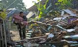 Seorang pria membawa barang-barangnya saat berjalan melewati lingkungan yang hancur akibat gempa Senin di Cianjur, Jawa Barat, Indonesia, Kamis, 24 November 2022. Gempa berkekuatan 5,6 SR itu menyebabkan ratusan orang tewas, luka-luka, dan hilang saat bangunan runtuh dan warga yang ketakutan berlarian. hidup mereka di pulau utama Indonesia di Jawa. (FOTO : AP/Tatan Syuflana)