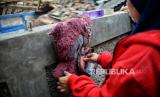 Tim SAR mencari seorang anak korban gempa yang diduga tertimpa reruntuhan bangunan. .