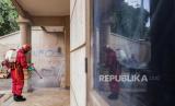 REPUBLIKA.CO.ID,JAKARTA -- Petugas Damkar menyemprot disinfektan pada rumah mewah terbengkalai di Jalan Paron, Cakung Jakarta, Kamis (5/1/2023).