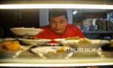 Indra (41) pemilik RM Padang Surya generasi ketiga membantu pramusaji lainnya saat menyiapkan nasi boks pesanan konsumen di Rumah Makan Padang Surya di Jalan Bendungan Hilir, Jakarta, Kamis (12/1/2023). Untuk satu porsi makanan di RM Padang Surya mulai dari Rp 20.000 hingga Rp 32.000. (FOTO : Republika/Thoudy Badai)