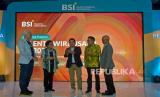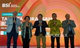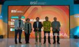 (dari kiri) Komisaris Utama PT Bank Syariah Indonesia Tbk Adiwarman Karim, Staff Ahli Bidang Keuangan & Pengembangan UMKM Kementrian BUMN Loto Srinaita Ginting, Direktur Utama PT Bank Syariah Indonesia Tbk (BSI) Hery Gunardi, Staff Ahli Menteri Bidang Ekonomi Makro Kementerian Koperasi & UKM Rulli Nuryanto dan Direktur Retail Banking BSI Ngatari berfoto pada launcing program Talenta Wirausaha BSI (TWB) 2023 di Jakarta, Kamis (19/1/2023). BSI kembali menggelar Talenta Wirausaha BSI (TWB) di tahun 2023. BSI memperluas kepersertaan TWB 2023 hingga ke pesantren untuk kategori santri. Kategori ini dipilih seiring komitmen perseroan mewujudkan untuk mendorong Islamic Ecosystem secara menyeluruh salah satunya pengembangan ekonomi syariah berbasis klaster pesantren. (FOTO : Republika/Prayogi)