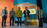 (dari kiri) Komisaris Utama PT Bank Syariah Indonesia Tbk Adiwarman Karim, Staff Ahli Bidang Keuangan & Pengembangan UMKM Kementrian BUMN Loto Srinaita Ginting, Direktur Utama PT Bank Syariah Indonesia Tbk (BSI) Hery Gunardi, Staff Ahli Menteri Bidang Ekonomi Makro Kementerian Koperasi & UKM Rulli Nuryanto dan Direktur Retail Banking BSI Ngatari berbincang pada launcing program Talenta Wirausaha BSI (TWB) 2023 di Jakarta, Kamis (19/1/2023). BSI kembali menggelar Talenta Wirausaha BSI (TWB) di tahun 2023. BSI memperluas kepersertaan TWB 2023 hingga ke pesantren untuk kategori santri. Kategori ini dipilih seiring komitmen perseroan mewujudkan untuk mendorong Islamic Ecosystem secara menyeluruh salah satunya pengembangan ekonomi syariah berbasis klaster pesantren. (FOTO : Republika/Prayogi)
