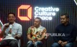 Jajaran Owner Creative Culture Space Anthony Gunawan (kiri), Farid Irawan (tengah) dan Ario Bimo (kanan) memberikan keterangan pada peluncuran Creative Culture Space di Jakarta, Jumat (27/1/2023). Creative Culture Space merupakan studio kreatif dengan sarana dan prasarana serta fasilitas yang membuat para pekerja kreatif lebih produktif dalam berkarya. (FOTO : Republika/Prayogi.)