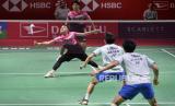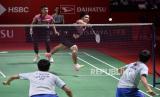 REPUBLIKA.CO.ID, SENAYAN -- Pertandingan ganda putra Indonesia Leo Rolly Carnando-Daniel Marthin melawan ganda putra Jepang Keiichiro Matsui-Yoshinori Takeuchi dalam babak perempat final Daihatsu Indonesia Master 2023 di Istora Senayan, Jumat (27/1/2023).
