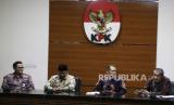 Deputi Pencegahan dan Monitoring KPK Pahala Nainggolan (kanan), menyampaikan keterangan pers disaksikan oleh Menteri Agama Yaqut Cholil Qoumas (kedua kiri), Kepala Badan Pengelola Keuangan Haji (BPKH) Fadlul Imansyah (kiri) dan Wakil Ketua KPK Nurul Ghufron (kedua kanan) usai mengadakan pertemuan di Gedung Merah Putih KPK, Jakarta, Jumat (27/1/2023). (FOTO : ANTARA FOTO)