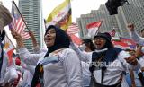 Sejumlah warga mengibarkan bendera negara anggota ASEAN dalam acara kick off keketuaan Indonesia dalam ASEAN 2023 di kawasan Bundaran Hotel Indonesia (HI), Jakarta, Ahad (29/1/2023). Acara tersebut menjadi awal rangkaian kegiatan yang puncaknya akan berlangsung dua kali yakni Konferensi Tingkat Tinggi (KTT) ASEAN pada Mei 2023 di Labuan Bajo, Provinsi Nusa Tenggara Timur (NTT) dan KTT ASEAN Plus di Jakarta pada September 2023. (FOTO : ANTARA FOTO/Aditya Pradana Putra)