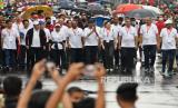 Presiden Joko Widodo (tengah) berjalan bersama jajaran menteri dan para duta besar negara-negara anggota ASEAN serta negara sahabat lainnya dalam Parade ASEAN di Jalan MH. Thamrin, Jakarta, Ahad (29/1/2023). Acara tersebut menjadi awal rangkaian kegiatan yang puncaknya akan berlangsung dua kali yakni Konferensi Tingkat Tinggi (KTT) ASEAN pada Mei 2023 di Labuan Bajo, Provinsi Nusa Tenggara Timur (NTT) dan KTT ASEAN Plus di Jakarta pada September 2023. (FOTO : ANTARA FOTO/Aditya Pradana Putra)