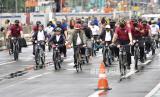 Presiden Joko Widodo (tengah) bersama Menteri Koordinator Bidang Politik, Hukum, dan Keamanan (Menkopolhukam) Mahfud MD (kelima kiri), dan Menteri Luar Negeri Retno Marsudi (ketiga kiri) bersepeda dari Istana Negara untuk mengikuti acara kick off keketuaan Indonesia dalam ASEAN 2023 di Bundaran Hotel Indonesia (HI), Jakarta, Ahad (29/1/2023). Acara tersebut menjadi awal dari rangkaian kegiatan yang puncaknya akan berlangsung dua kali, yakni Konferensi Tingkat Tinggi (KTT) ASEAN pada Mei 2023 di Labuan Bajo, Provinsi Nusa Tenggara Timur (NTT) dan KTT ASEAN Plus di Jakarta pada September 2023. (FOTO : ANTARA FOTO/Dhemas Reviyanto)