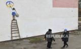 Warga melintas didepan mural yang dibuat oleh TVBOY di dinding pusat budaya yang rusak di kota Irpin, dekat Kyiv, Ukraina, Sabtu (28/1/2023). (FOTO : EPA-EFE/ANDRII NESTERENKO)