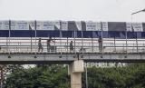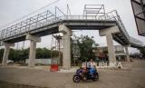 Warga melintas di depan proyek pembangunan jembatan multiguna (skybridge) di Bojonggede, Kabupaten Bogor, Jawa Barat, Senin (30/1/2023). Pembangunan Skybridge tersebut merupakan proyek kerja sama Badan Pengelola Transportasi Jabodetabek (BPTJ) dengan Pemkab Bogor yang akan menghubungkan stasiun dengan terminal Bojonggede, dan pembangunan konstruksi skybridge itu telah mencapai 90 persen. ANTARA FOTO/Yulius Satria Wijaya/foc. (FOTO : Antara/Yulius Satria Wijaya)