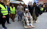 Orang-orang memindahkan petugas polisi yang terluka ke rumah sakit setelah ledakan di sebuah masjid ke sebuah rumah sakit di Peshawar, Pakistan, (30/1/2023). EPA-EFE/ARSHAD ARBAB (FOTO : EPA-EFE/ARSHAD ARBAB)