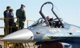 Sekretaris Jenderal Organisasi Pakta Pertahanan Atlantik Utara (NATO), Jens Stoltenberg (kanan), duduk di kokpit pesawat jet tempur F-2A Pasukan Bela Diri Udara Jepang (JASDF) di Pangkalan Udara Iruma JASDF, di Sayama, Prefektur Saitama, Jepang, Selasa (31/1/2023). (FOTO : EPA-EFE/KIMIMASA MAYAMA)