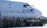 Sekretaris Jenderal Organisasi Pakta Pertahanan Atlantik Utara (NATO), Jens Stoltenberg, mengikuti sesi foto bersama anggota Angkatan Udara Bela Diri Jepang (JASDF) di depan pesawat angkut C-2 JASDF di Pangkalan Udara Iruma JASDF, di Sayama, Prefektur Saitama , Jepang, Selasa (31/1/2023). (FOTO : EPA-EFE/KIMIMASA MAYAMA)