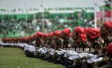 Banser saat menampilkan marching band dalam acara pembukaan Resepsi Satu Abad Nahdlatul Ulama di Stadion Gelora Delta Sidoarjo, Jawa Timur, Selasa (7/2/2023). Presiden bersama Wakil Presiden dan sejumlah Menteri Kabinet Indonesia Maju menghadiri acara Resepsi Puncak Satu Abad NU sekaligus meresmikan dan membuka kegiatan tersebut. Acara resepsi tersebut berlangsung selama 24 jam dengan diisi beragam kegiatan seperti membaca shalawat dan shalat qiyamul lail, karnaval kebudayaan nusantara, bazar UMKM, dan panggung hiburan rakyat yang akan diisi oleh sejumlah band dan musisi seperti Slank, Rhoma Irama dan Maher Zain. (FOTO : Republika/Thoudy Badai)