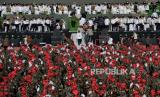 Banser melakukan koreografi dalam acara pembukaan Resepsi Satu Abad Nahdlatul Ulama di Stadion Gelora Delta Sidoarjo, Jawa Timur, Selasa (7/2/2023). Presiden bersama Wakil Presiden dan sejumlah Menteri Kabinet Indonesia Maju menghadiri acara Resepsi Puncak Satu Abad NU sekaligus meresmikan dan membuka kegiatan tersebut. Acara resepsi tersebut berlangsung selama 24 jam dengan diisi beragam kegiatan seperti membaca shalawat dan shalat qiyamul lail, karnaval kebudayaan nusantara, bazar UMKM, dan panggung hiburan rakyat yang akan diisi oleh sejumlah band dan musisi seperti Slank, Rhoma Irama dan Maher Zain. (FOTO : Republika/Thoudy Badai)
