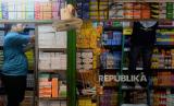 Pekerja merapikan obat di Pasar Pramuka, Jakarta, Rabu (8/2/2023). Badan Pengawas Obat dan Makanan mengumumkan obat sirup Praxion dinyatakan aman dikonsumsi berdasarkan serangkaian pengujian yang telah dilakukan menggunakan tujuh sampel dengan hasil memenuhi syarat. (FOTO : Republika/Putra M. Akbar)