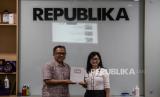 Wakil Pemimpin Redaksi Republika Nur Hasan Murtiaji (kiri) menerima cinderamata dari Compliance Director and Corporate Secretary Bank Jago Tjit Siat Fun (kanan) saat berkunjung ke kantor Republika di Jakarta, Kamis (23/2/2023). Kunjungan tersebut untuk memperkenalkan profil dan fitur dari Bank Jago. (FOTO : Republika/Putra M. Akbar)
