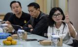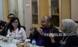 Compliance Director and Corporate Secretary Bank Jago Tjit Siat Fun (kanan) bersama Head of Sharia Business Develeopment & Product Solution Bank Jago Waasi B. Sumintardja (tengah) memberikan paparan saat berkunjung ke kantor Republika di Jakarta, Kamis (23/2/2023). Kunjungan tersebut untuk memperkenalkan profil dan fitur dari Bank Jago. (FOTO : Republika/Putra M. Akbar)