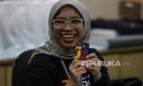 Head of Sharia Customer Value Nur Fajriah Rachmah (kanan) memperlihatkan kartu Bank Jago saat berkunjung ke kantor Republika di Jakarta, Kamis (23/2/2023). Kunjungan tersebut untuk memperkenalkan profil dan fitur dari Bank Jago. (FOTO : Republika/Putra M. Akbar)