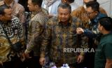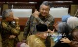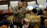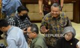 Calon Tunggal Gubernur Bank Indonesia (BI) Perry Warjiyo berbincang usai mengikuti fit and proper test oleh Komisi XI DPR di Kompleks Parlemen Senayan, Jakarta, Senin (20/3/2023). Komisi XI DPR RI sepakat memilih Perry Warjiyo untuk kembali menjabat sebagai Gubernur Bank Indonesia (BI) untuk periode 2023-2028 setelah melalui proses uji kelayakan dan kepatutan atau fit and proper test. (FOTO : Republika/Prayogi.)