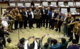 Calon Tunggal Gubernur Bank Indonesia (BI) Perry Warjiyo (tengah) berfoto usai mengikuti fit and proper test oleh Komisi XI DPR di Kompleks Parlemen Senayan, Jakarta, Senin (20/3/2023). Komisi XI DPR RI sepakat memilih Perry Warjiyo untuk kembali menjabat sebagai Gubernur Bank Indonesia (BI) untuk periode 2023-2028 setelah melalui proses uji kelayakan dan kepatutan atau fit and proper test. (FOTO : Republika/Prayogi.)