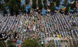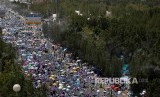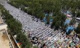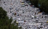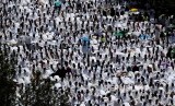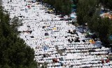 Jamaah haji Shalat Zhuhur yang meluber di luar Masjid Namirah, Padang Arafah, Sabtu (10/10). (FOTO : Umit Bektas/Reuters)