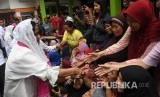 Ibu Negara Iriana Joko Widodo (kiri) berjabat tangan dengan korban banjir saat melakukan kunjungan kerja di Periuk Jaya Permai, Tangerang, Banten, Jumat (3/1/2020). (FOTO : Antara/Akbar Nugroho Gumay)