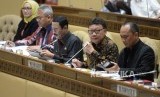 Pembahasan Persiapa Pemilu. Mendagri Tjahjo Kumolo (ketiga kanan) menyampaikan paparan saat Rapat Kerja dengan Komisi II DPR RI di Komplek Parlemen Senayan, Jakarta, Kamis (6/12). (FOTO : Republika/ Wihdan)