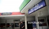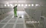 Petugas mebersihkan toilet di SPBU 44 521 08 jalur Pantura, Tegal, Jateng, Selasa (12/6). (FOTO : Republika/Prayogi)