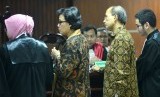 Mantan Menkeu Sri Mulyani Indrawati (kedua kiri) bersama terdakwa Budi Mulya (kedua kanan) saat mengikuti sidang kasus Bank Century di Pengadilan Tipikor, Jakarta, Jumat (2/5). (Republika/Agung Supriyanto)