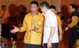 Ketua Umum Partai Hanura, Wiranto (kiri) berbincang dengan Ketua Badan Pemenangan Pemilu (Bapilu) Hanura Hary Tanoesoedibjo usai membuka Rapimnas Partai Hanura di Jakarta, Selasa (6/5). (Republika/Aditya Pradana Putra)