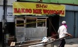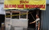REPUBLIKA.CO.ID, JAKARTA -- Warga melintas di depan gerobak bakso mie milik Sutiman Wasis Utomo (45 tahun) yang disegel Polisi di RT 07/08 Kelurahan Pekojan, Kecamatan Tambora, Jakarta Barat, Rabu (7/5).